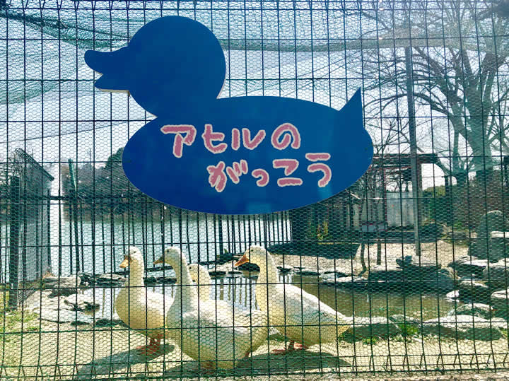 日中は檻から出ているので、すぐ近くで見れます。アヒルのお尻がかわいくて、ずっと見てられる!ベンチもあるので、1歳児も、幼稚園児も、小学生も、じぃーと観察(^^)。やはり、子どもにとって動物の魅力は凄まじいようです。