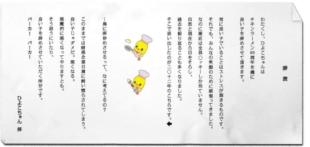 辞表を出しただけでなく、ひよこちゃんは日清のサイトにいたずらで落書きまでしてました。