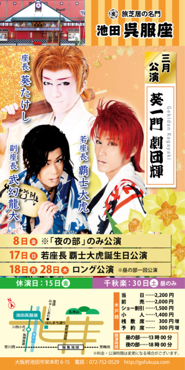 旅芝居の名門「池田 呉服座」の三月公演『葵一門 劇団輝』をご案内します。 大衆演劇がお好きな方も、これまでご覧になったことがない方も、ぜひこの機会に池田呉服座へ足を運んでみてください。