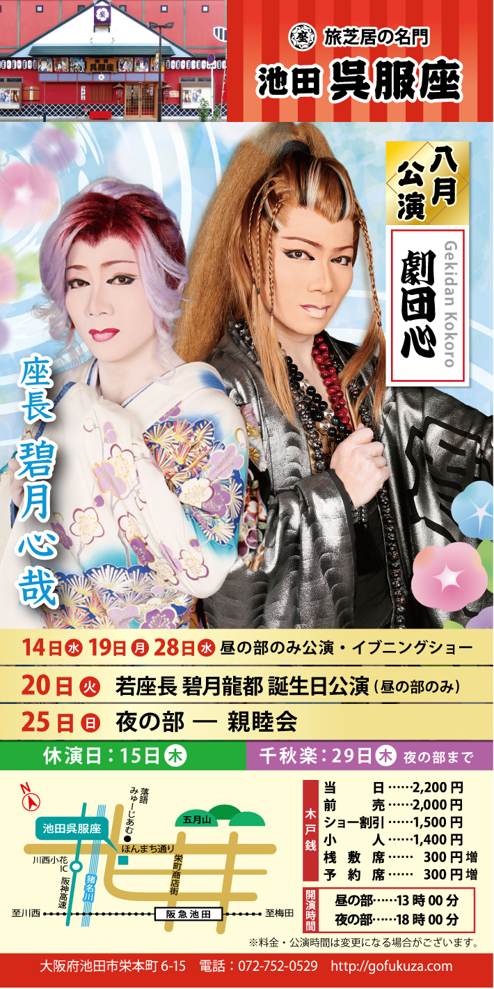旅芝居の名門「池田 呉服座」の八月公演『劇団心』をご案内します。 大衆演劇がお好きな方も、これまでご覧になったことがない方も、ぜひこの機会に池田呉服座へ足を運んでみてください。